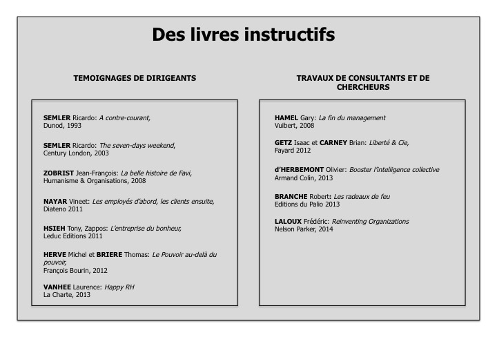La littérature actuelle sur le management reflète cette sympathique effervescence. On y trouve des témoignages directs de dirigeants et des compilations commentées d’expériences réussies. Une littérature qui, soit dit en passant, redécouvre ce qu’un siècle auparavant l’américaine Mary Parker Follett disait déjà sur le sujet, sans être entendue, ainsi que les avertissements et recommandations oubliées formulées par Taylor et ses congénères. Il est vrai qu’il y avait à l’époque toute une industrie à construire et que leurs raffinements ou scrupules pouvaient attendre…